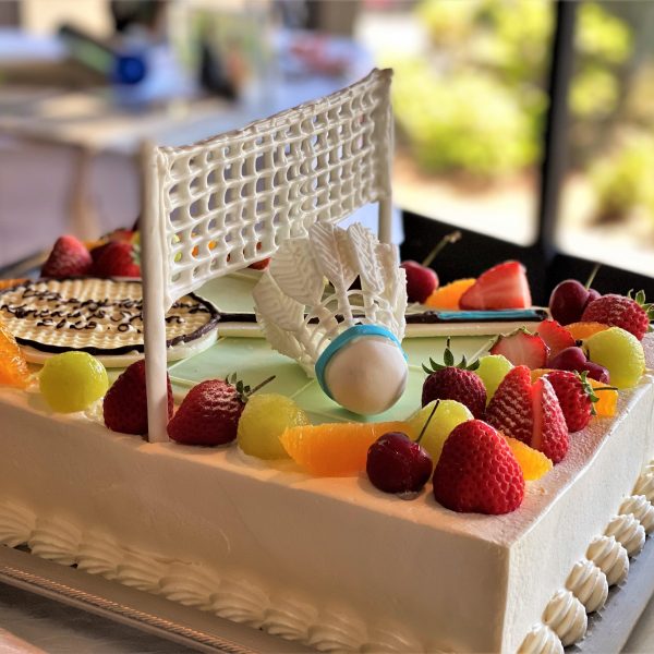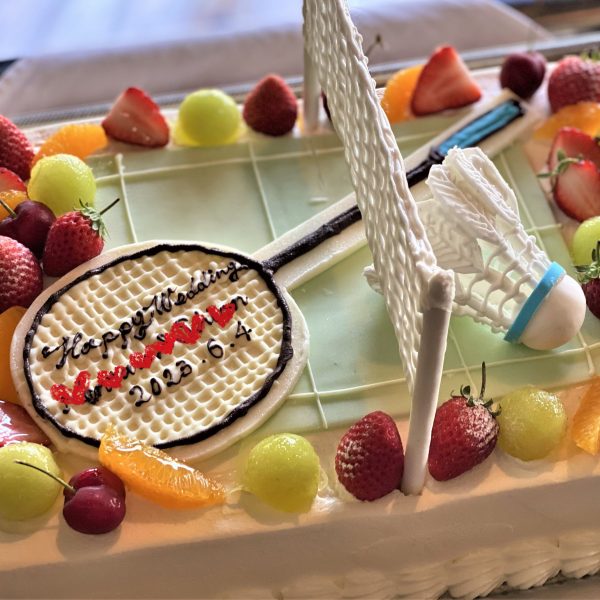 バドミントンモチーフのウエディングケーキの出来栄えに「わーお!!」と驚きを隠せませんでした!コート上にラケットと精巧に作られたシャトル。ためらいながらも祝入刀です❤